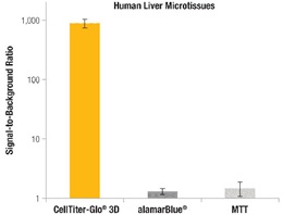 InSphero Insight™ human liver microtissues (~250µm) were assayed as instructed by the manufacturer. Total assay time for CellTiter-Glo® 3D, alamarBlue® and MTT assays were 30 minutes, 3 hours and 8 hours, respectively.