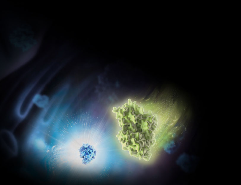 Other substrate and enzyme pairings can also generate bioluminescence. The color, intensity and duration of the emitted light will vary depending on the thermodynamics and kinetics of the specific reaction. For example, our scientists used directed evolution to transform a deep-sea shrimp’s bioluminescence system into our NanoLuc® luciferase system. Compared to native firefly luciferase, the reaction of NanoLuc® with its furimazine substrate is 100 times brighter.